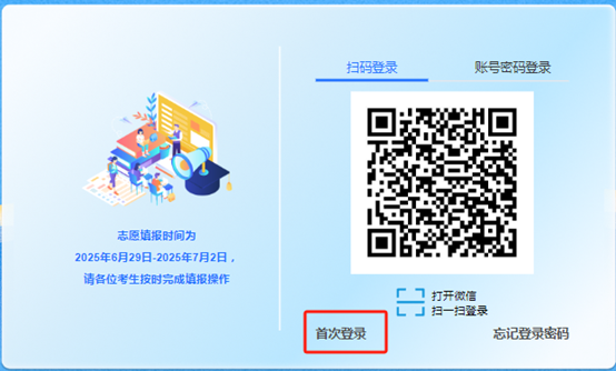 第三步:完成首次登录。选择【账号密码登录】页面,点击【首次登录】。输入14位考生号(即高考报名号)、初始密码(考生身份证号)登录进入信息补充页面,依次完成修改登录密码、绑定增强方式、填写个人资料、填写志愿保存密码四个步骤。